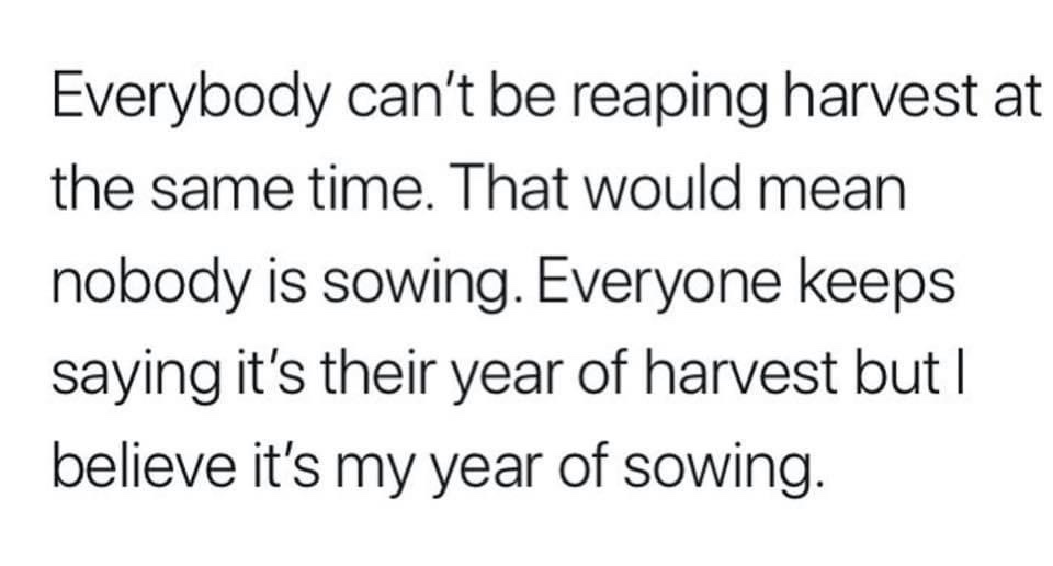 Seed time, harvest, winter… Repeat. You look at life in a new perspective when you understand you’re supposed to be content in all 3 of the aforementioned. For me, I believe it’s seed (sowing) time. The first thing Eve did after being brought into existence was NOT harvest. It was shared work in the grow/seed time.